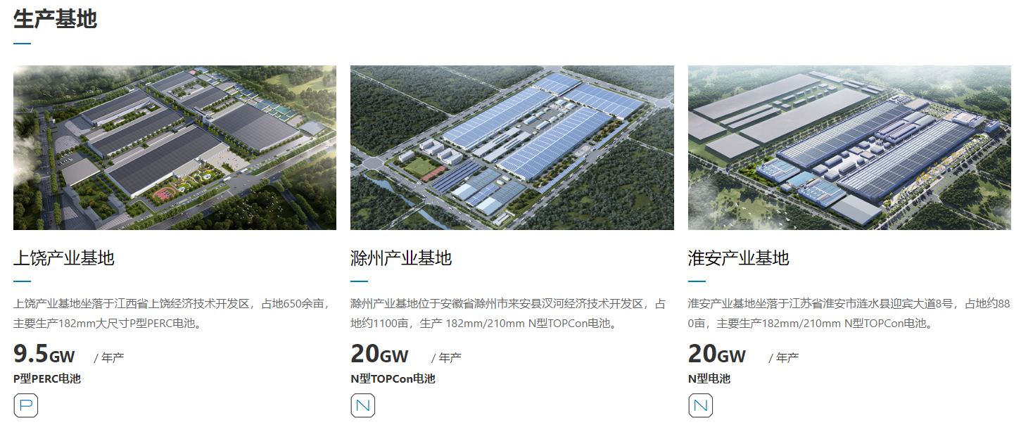 深耕光伏电池行业十余载,公司始终专注光伏电池核心技术,不断加大研发投入保持技术领先,产能规模持续保持行业前列。2022年,公司率先行业实现N型TOPCon电池大规模量产,推动行业电池技术由P型向N型升级迭代。凭借技术领先优势不断扩张新产能,公司电池产能总规模53.5GW。