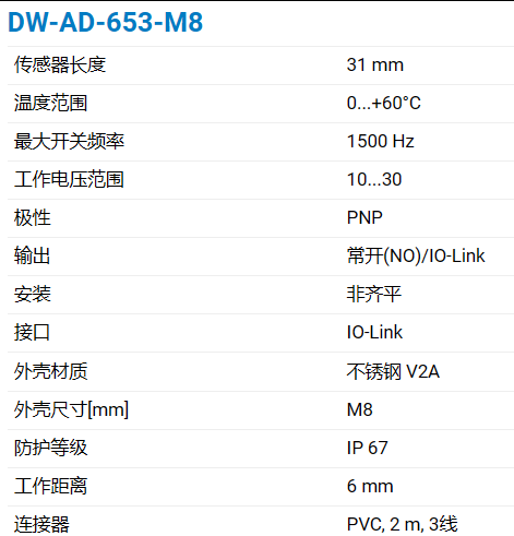 DW-AD-653-M8连接: PVC,2m,3线M8 3芯极性和输出:PNPI常开(NO)/I0-Link传感器长度:31 mm