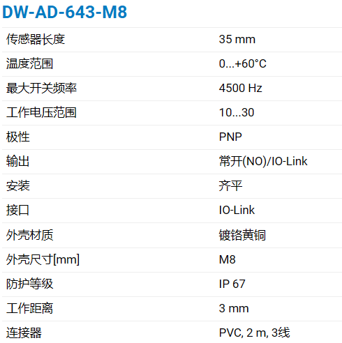 DW-AD-643-M8连接:PVC,2m,3线极性和输出:PNPI常开(NO)/10-Link传感器长度:35 mm