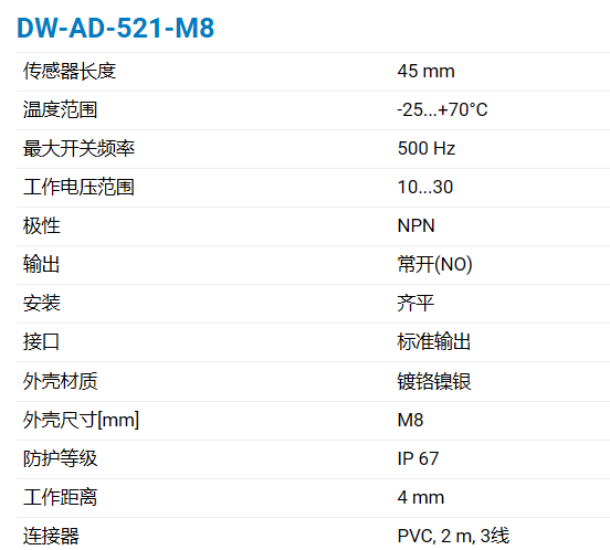 DW-AD-521-M8连接:PVC,2m,3线PVC,2m,3线M12 4芯M8 3芯极性和输出:NPNI常开(NO)NPN|常开 (NO)NPN|常闭(NC)PNP|常开 (NO)PNP|常开 (NO)/IO-LinkPNP|常闭(NC)传感器长度:45 mm