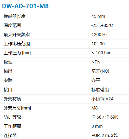 DW-AD-701-M8连接: PUR,2m,3线PUR,2 m,3线M12 4芯M8 3芯PUR,0.5 m,3线+M8 3芯PUR,0.2 m,3线+M8 3芯极性和输出:NPNI常开(NO)NPN|常开(NO)NPN|常闭(NC)PNP|常开 (NO)/IO-LinkPNP|常闭(NC)传感器长度:45mm