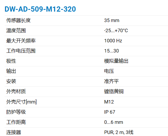 DW-AD-509-M12-320连接: PUR,2m,3线PUR,2 m,3线极性和输出:模拟量|电压模拟量|电压传感器长度:35 mm