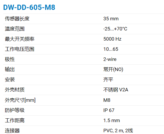 DW-DD-605-M8连接: PVC,2m,2线PVC,2 m,2线M12 4芯M83芯极性和输出:2-wire|常开(NO)2-wire|常开(NO)2-wire|常闭(NC)传感器长度:35mm