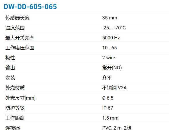 DW-DD-605-065连接:PVC,2m,2线PVC,2 m,2线极性和输出:2-wire|常开(NO)2-wire|常开 (NO)传感器长度和安装方式:35 mm|齐平