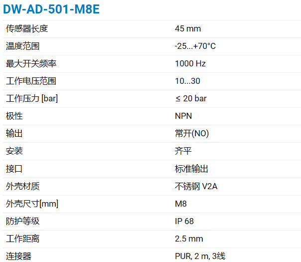 DW-AD-501-M8E连接: PUR,2m,3线PUR,2 m,3线极性和输出:NPNI常开(NO)NPN|常开(NO)NPN|常闭(NC)PNP|常开 (NO)/IO-LinkPNP|常闭(NC)传感器长度:45 mm