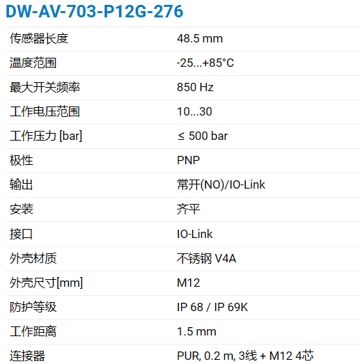 DW-AV-703-P12G-276连接: PUR,0.2m,3线+M124芯PUR,0.2 m,3线+M12 4芯PUR,2 m,3线M12 4芯极性和输出:PNPI常开(NO)/I0-LinkPNP|常开 (NO)/IO-Link传感器长度和与螺纹的距离:48.5 mm|18 mm