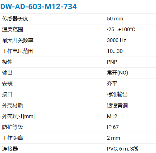 DW-AD-603-M12-734连接:PVC,6m,3线PVC,6 m,3线极性和输出:PNPI常开(NO)PNP|常开(NO)传感器长度:50 mm