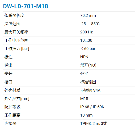 DW-LD-701-M18连接:TPE-S,2m,3线TPE-S,2m,3线TPE-S,5m,3线M12 4芯极性和输出:NPNI常开(NO)NPN|常开(NO)NPN|常闭(NC)PNP|常开 (NO)/IO-LinkPNP|常闭(NC)传感器长度:70.2mm
