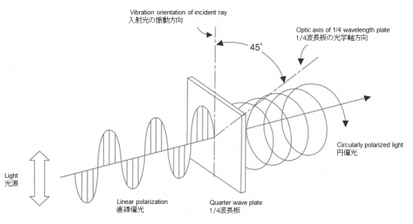 当从光源发射的非偏振光线入射时,发射光束呈圆偏振,线偏振器和1/4波片的结合称为圆偏振器。