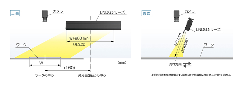 LNDG 系列沿倾斜方向照射,以检测“垂直皱纹和不规则性”。 选择照明时,请选择比要检查的工件宽度至少长 200 mm 的尺寸。 此外,我们建议照射距离为 50 毫米以获得足够的照度。