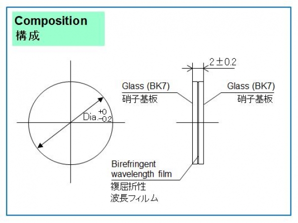 複屈折性を持たせた波長フィルムを光学硝子や石英など光学特性が優れた基板の間に挟み込んで接合しています。