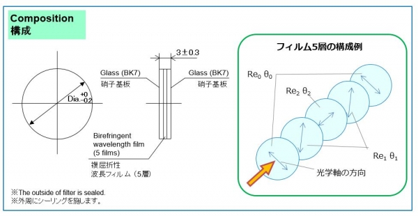 複屈折性を持たせた樹脂フィルムを積層し、光学硝子や石英など光学特性が優れた基板の間に挟み込んで接合しています。