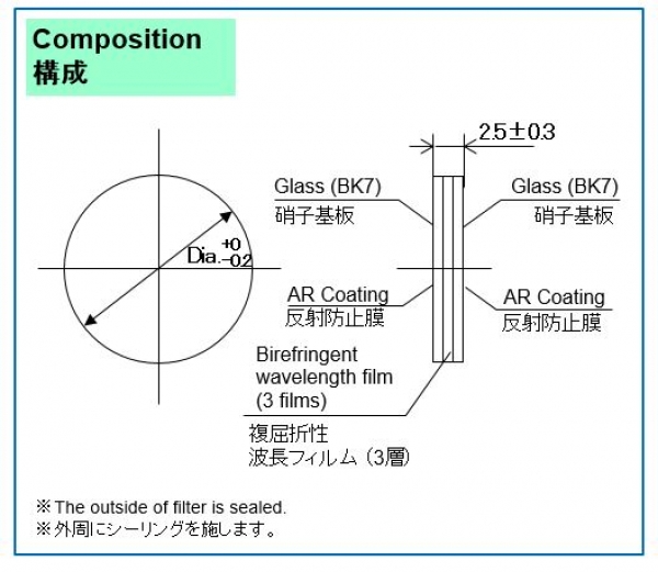 複屈折性を持たせた樹脂フィルムを積層し、光学硝子や石英など光学特性が優れた基板の間に挟み込んで接合しています。